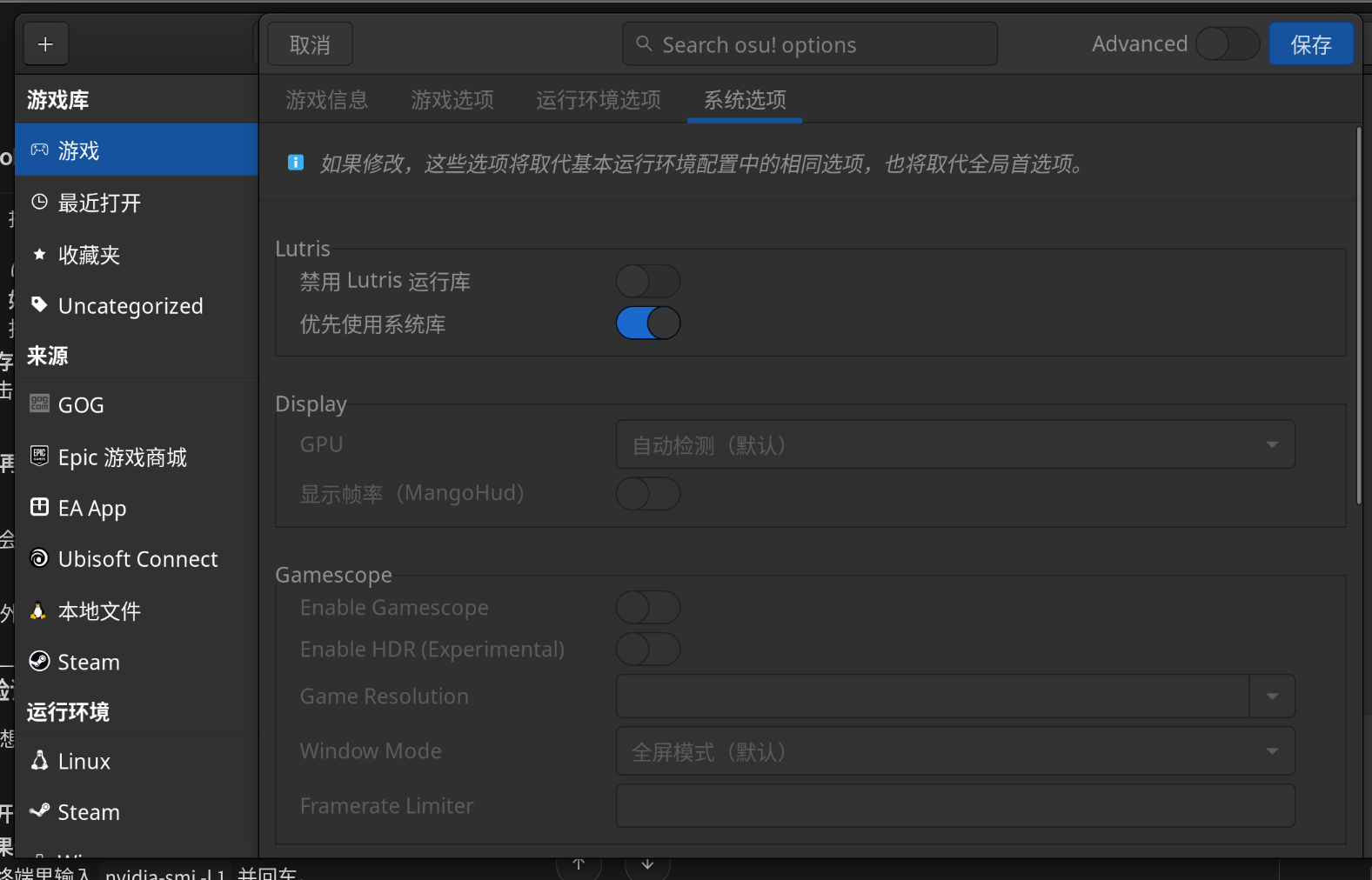 打开的时候就感觉不对,选歌的时候感觉更不对了,打开不限制帧数,一进游戏一看右下角,3.7ms,天塌了。要知道在AtlasOS上只有基本0.3ms左右,不知道是啥问题。查看Lutris,显示选项框下面的GPU是灰色的,连MangoHud的显示帧率都是灰色的。百思不得其解。尝试关闭过”优先使用系统库“和安装nvidia-prime都试过了,毫无卵用,所以这个时候就怀疑是BIOS层面出了问题。