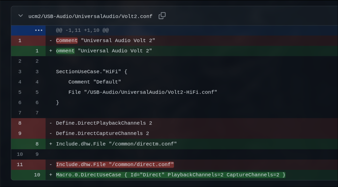 为了验证猜想,我随便找了HiFi.conf,这个位于[ucm2/HDA/HiFi.conf](https://github.com/alsa-project/alsa-ucm-conf/blob/27dc3eec31ec3205b116d49fd7d9f5fef209a5c2/ucm2/HDA/HiFi.conf#L4)