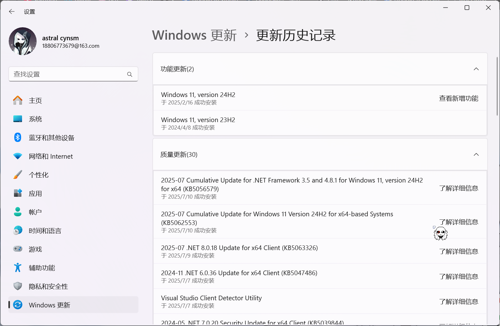 如上图,有 .NET 和 Windows 11, version 24H2 相关的更新,这些都属于会修改系统核心组件的更新。这些更新(特别是与Hyper-V、WSL、Windows Sandbox或网络堆栈相关的更新)会重置或修改系统的动态端口排除范围,以确保这些功能可以正常运行而不产生端口冲突。然后就把8000占了。