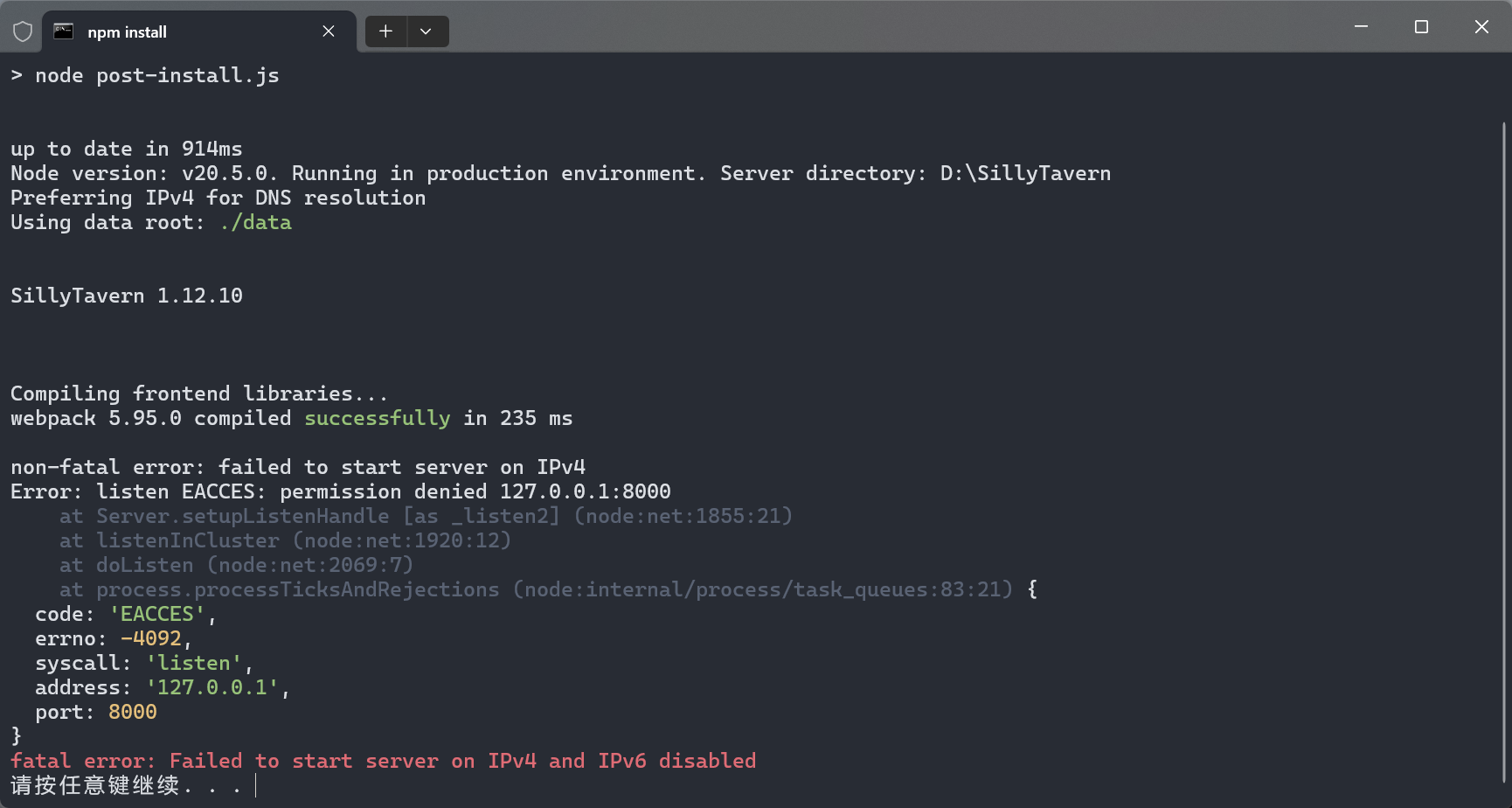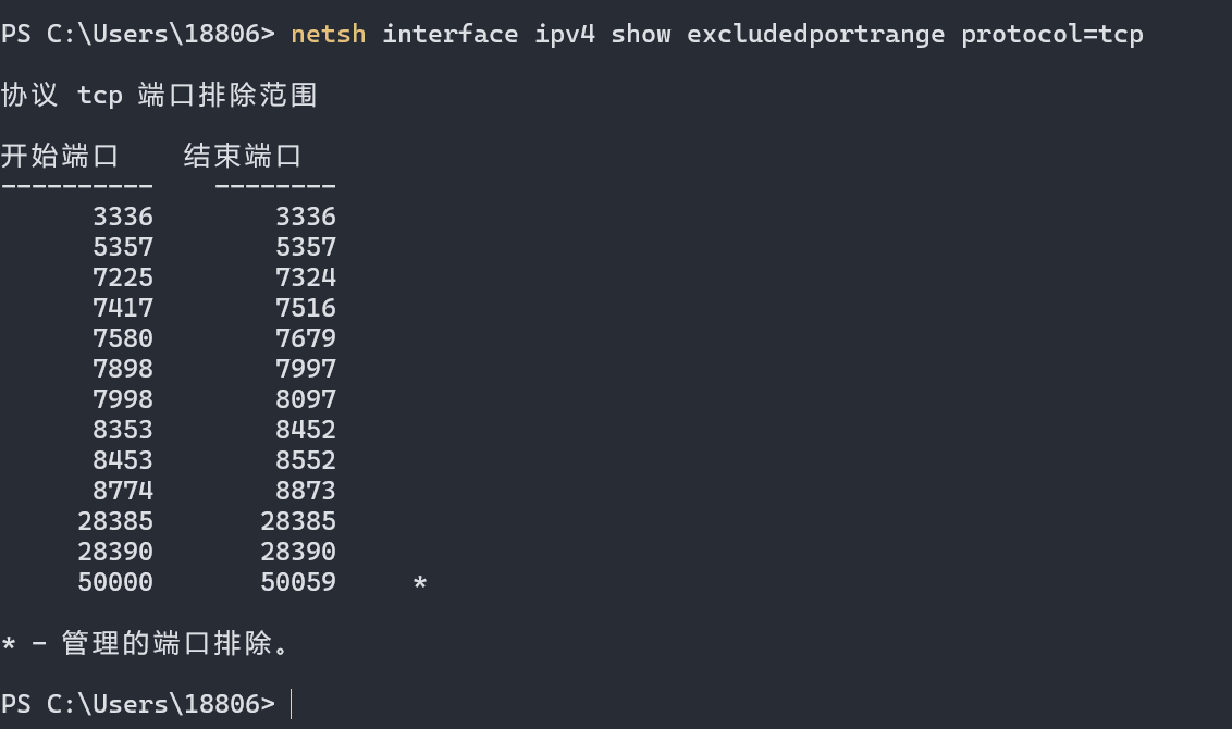 但是没有效果。所以这个时候重新把矛头指向端口被占用的问题。先试netstat -aon | findstr "8000",返回空。这个时候就知道估计是系统层面的占用了。试netsh interface ipv4 show excludedportrange protocol=tcp 。果然出现了包含8000在范围以内的协议tcp端口排除范围: